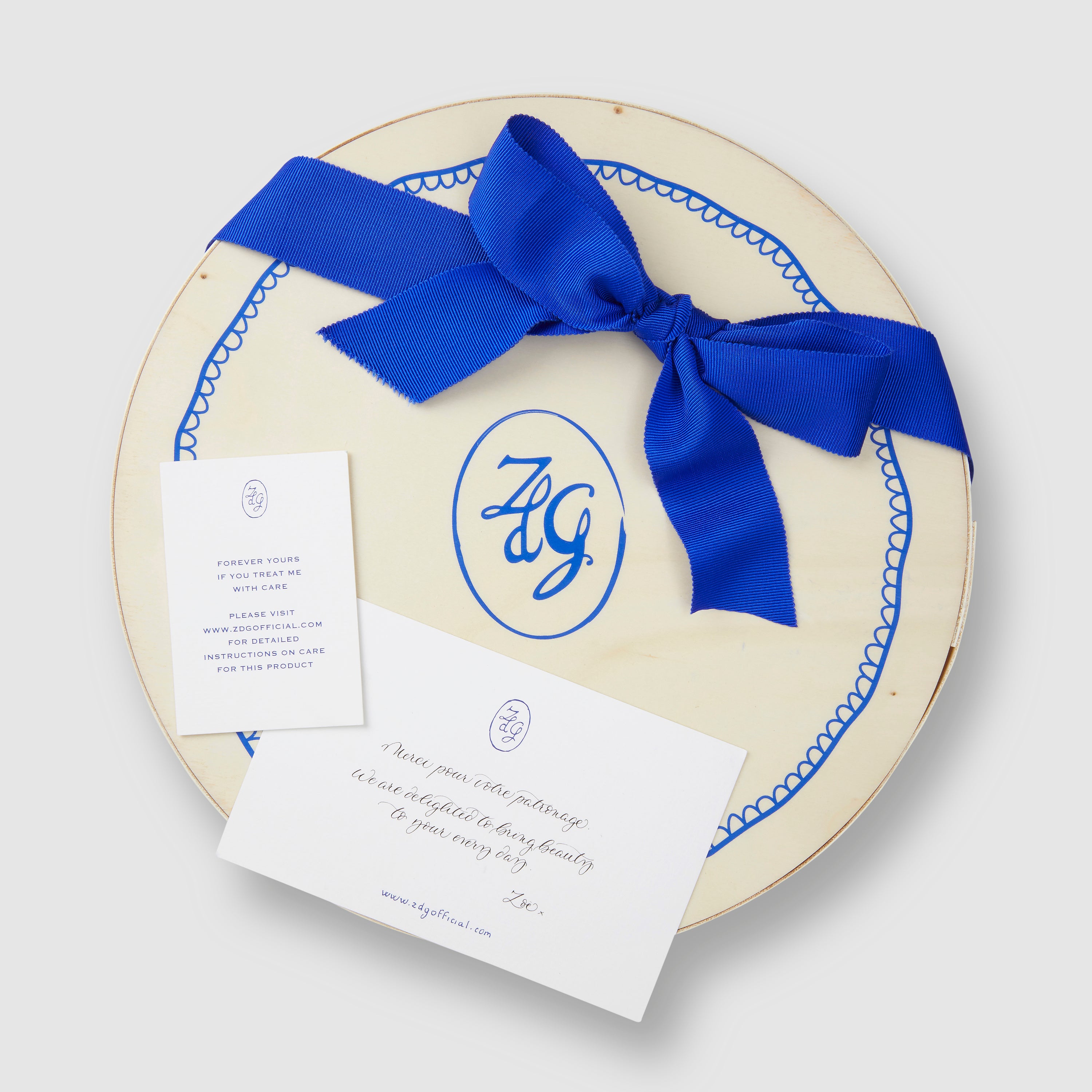 Bespoke hand written note card, packed in our signature French poplar wood boxes, with a hand tied grosgrain ribbon, felt plate stackers included.